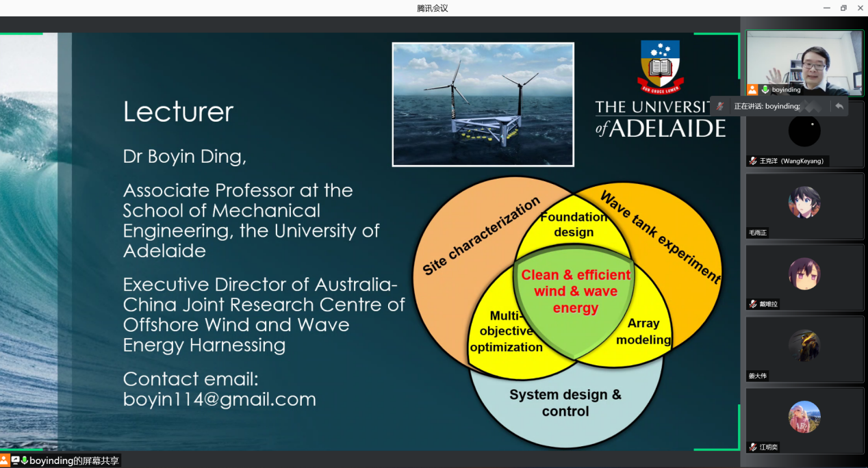 7月6日至8月11日,应304永利官网登录入口任树伟老师邀请,阿德莱德大学Boyin Ding副教授于线上开展了波浪能捕获概论课程。