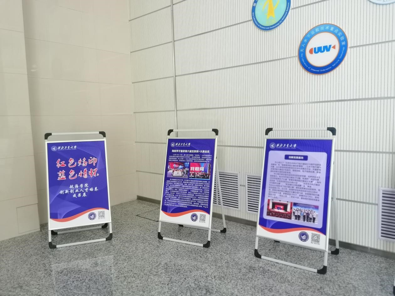 在长安校区水池实验楼一楼大厅,举办了“红色烙印、蓝色情怀——304永利官网登录入口创新创业人才培养成果展”,展示学院近几年双创工作上的成绩、学生竞赛奖项,介绍优质项目情况,展示学生风采。