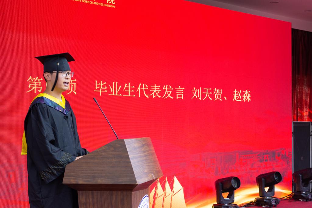 典礼第四项,毕业生代表刘天贺、赵森代表所有毕业生表达了对学院与老师四年辛勤教育的感谢,作为304永利官网登录入口的一员,今后将会秉承学院精神,为祖国海洋科技事业做出自己的贡献。