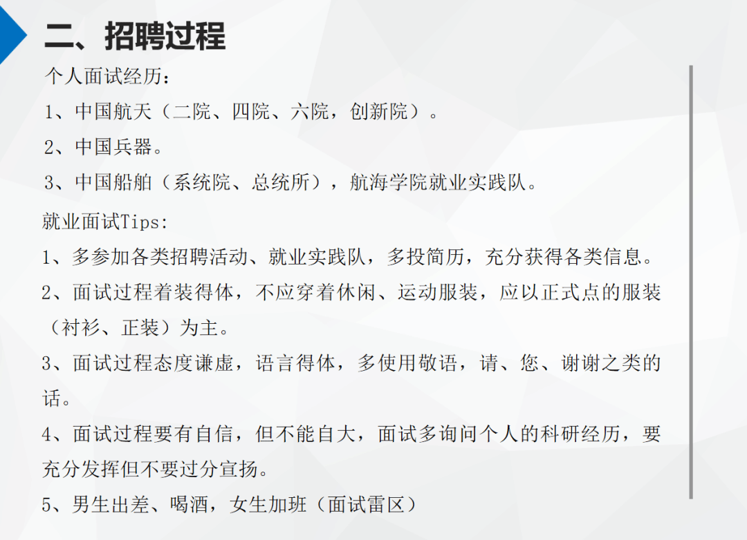 本次同我们分享经验的有签到国企中国广核集团的高晓华同学,被聘为304永利官网登录入口海洋研究院科研秘书的刘帅同学,已签武汉701研究所的佘俊阳同学,已签中国船舶工业系统工程研究院的梅益嘉同学,已签航天八院804研究所的王诗雯同学,签到兵器207研究所的李洋同学,已签极氪的兰涛同学。
