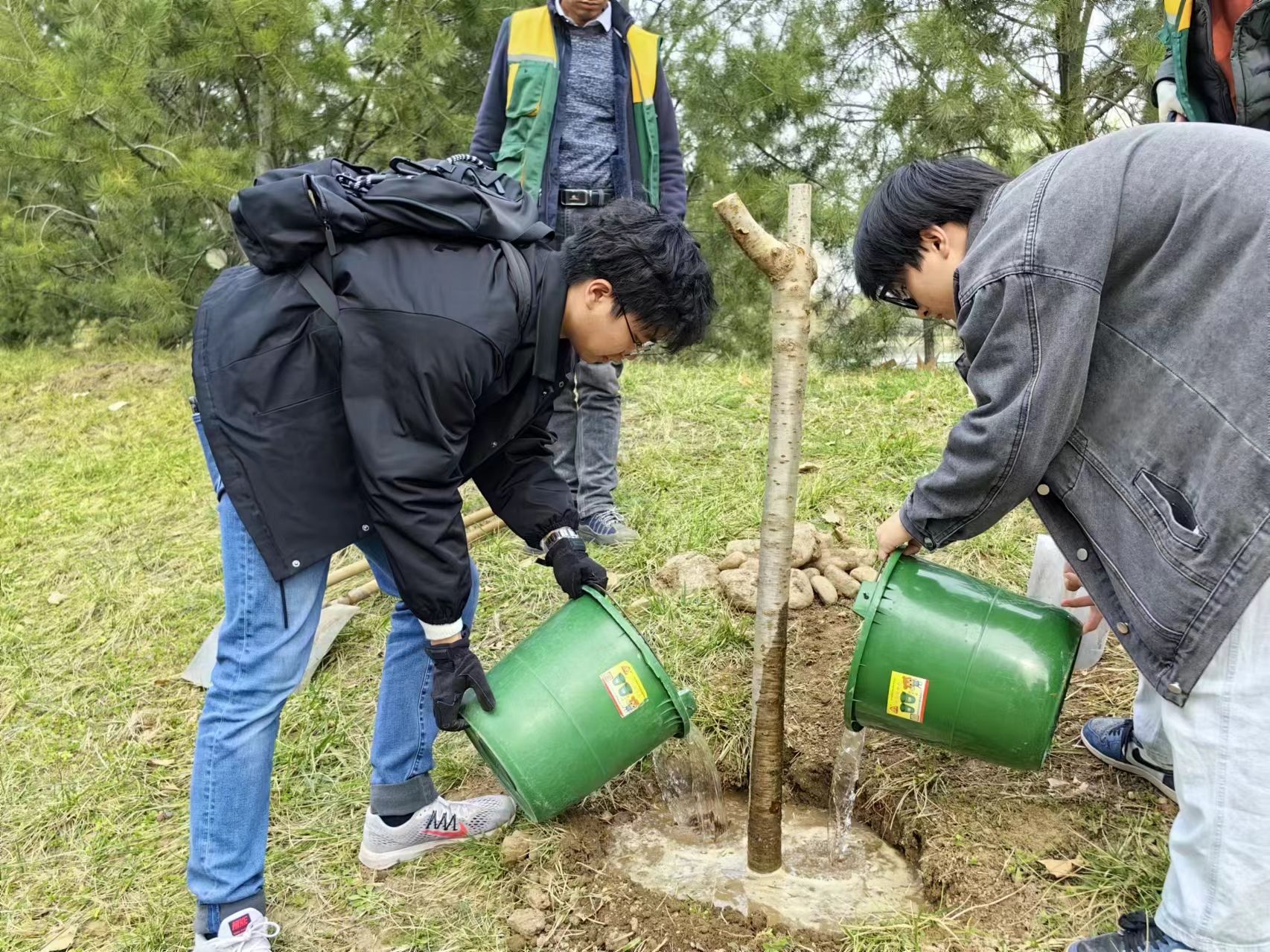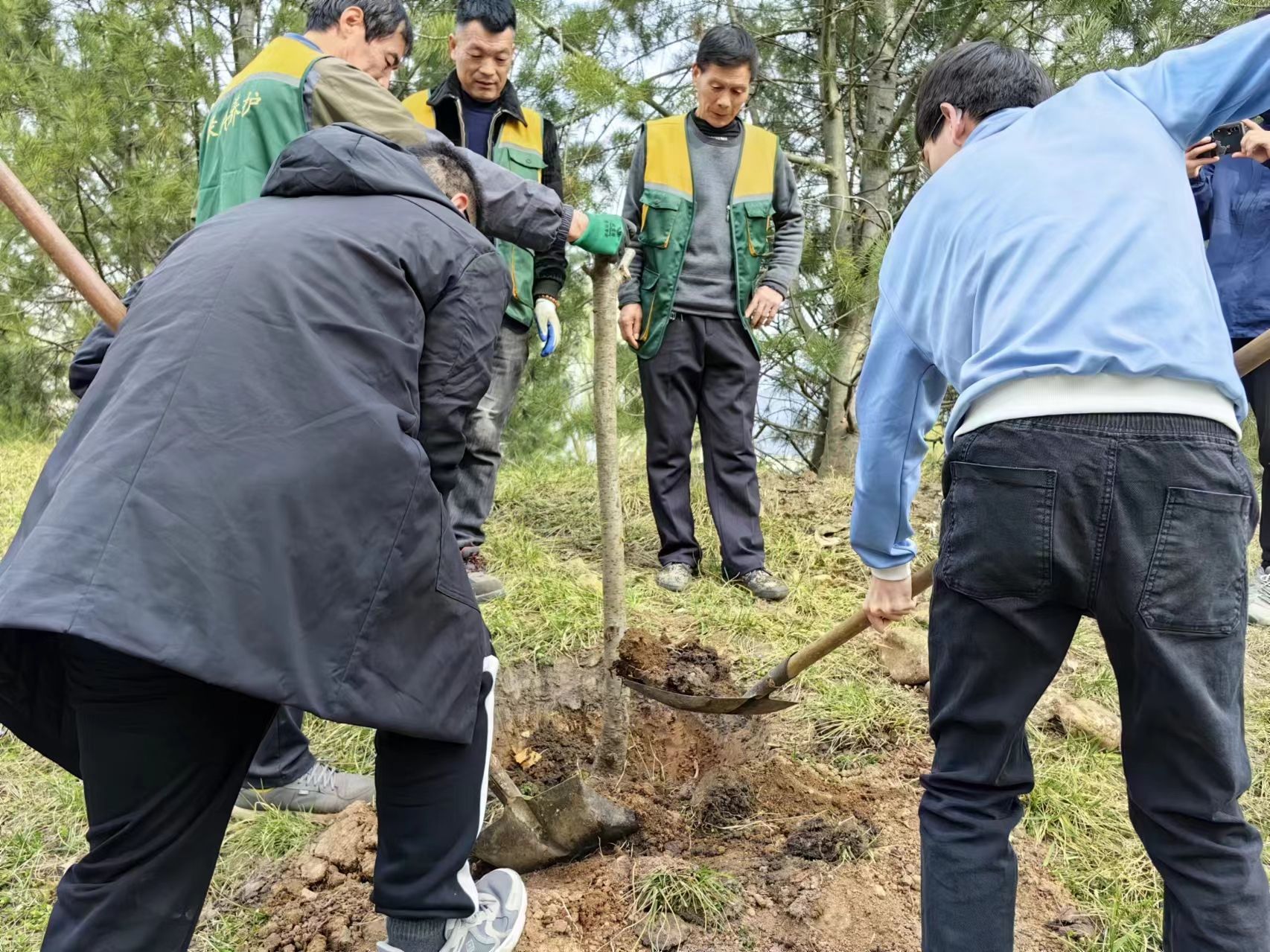用爱“浇”朋友,用心交朋友。知识讲解结束,进入实践环节,同学们纷纷拿起工具,有序投入植树工作中。“同学,我来帮你扶正树苗。”“浇水了,浇水了,小心水花飞溅!”大家彼此搭伙,在老师的指导下,精心为樱花树苗置办新家。