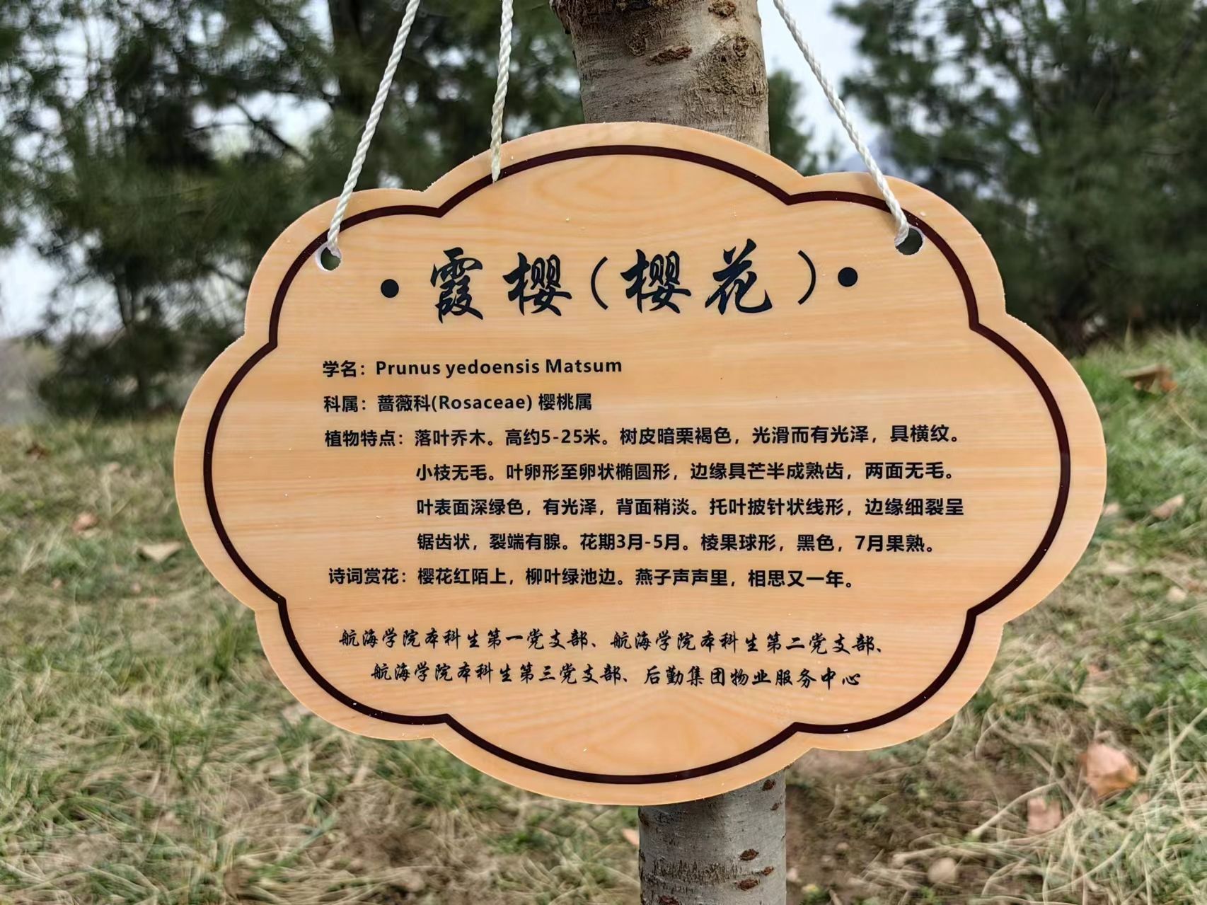 挖坑、摆苗、填土、浇水……随着最后一抔土壤的落定,最后一桶清泉的润泽,科普小名牌挂上枝头,大功告成,拍照打卡!擦干额头的汗水,拂去裤脚的轻尘,看着眼前的一株株樱花苗入住“海天雅居”,同学们的脸上无不洋溢着灿烂的笑容。欢声笑语间,本次植树活动圆满结束。