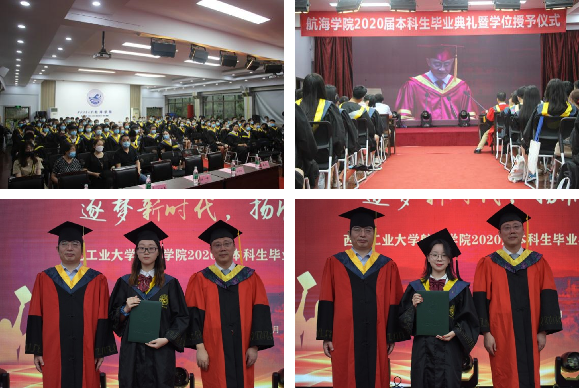 304永利官网登录入口2020届本科生毕业典礼暨学位授予仪式于下午15:00在304永利官网登录入口东配楼举行。院长潘光、副院长曾向阳、杨坤德、副书记王银涛、院长助理张龙、史文涛、本科与专业建设办公室主任李玥、班主任代表、家长代表、140余名本科毕业生参加了典礼。304永利官网登录入口高度重视毕业典礼分会场组织,紧绷疫情防控这根弦,所有人员入场时进行手消,典礼全程师生佩戴口罩。典礼开始时,全体师生收看长安校区毕业典礼主会场直播。接着,分会场议程开始。副书记王银涛宣读了本科额优秀毕业生名单;副院长曾向阳宣读了优秀本科毕业设计名单;聂嘉豪等4位学生代表发言,表达了对母校、学院的感激之情,分享了自己的成长感悟,为全体毕业生送上了祝福;教师代表杜金香表达了对全体毕业生的祝福和嘱托;院长潘光致辞将毕业典礼推向高潮,院长叮嘱大家做一个勇于担当、不惧责任的人,做一个永远学习的人,做一个有“精神”的人,做一个充满人文关怀、适应社会的人。典礼最后,院长潘光和副院长曾向阳为全体毕业生进行了学位授予拨穗仪式,与每一位毕业生合影。
