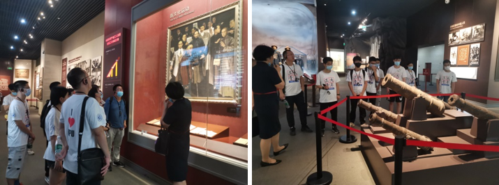 接下来,队员们移步至南湖革命纪念馆。在纪念馆中大家在讲解员的带领下重点学习了自鸦片战争到新中国成立的这一段历史,以及这一时期中西方的发展对比。队员们看到许多先辈在革命之初的黑暗中摸索前行,最终找到了一条适合中国的革命道路。中国共产党从成立之初的58名党员一直发展到如今的九千多万党员,九十九年的风雨兼程、不忘初心,在红船精神的指引下,领导全体中国人民通过一代又一代的努力奋斗,朝着中华民族的伟大复兴不断前行。带队老师任树伟代表实践队在纪念馆留言“不忘初心不负韶华,牢记使命奋发远航”,作为海院学子,我们一定努力学习,在红船精神的激励下,不断成长。