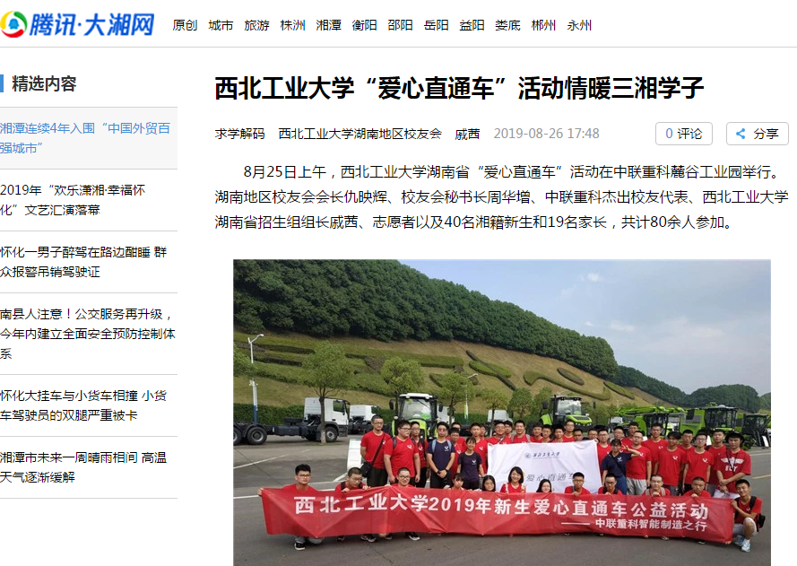 2019年8月25日上午8:00,304永利官网登录入口湖南省“爱心直通车”活动在中联重科麓谷工业园正式拉开帷幕。304永利官网登录入口校友会副秘书长孙武斌、湖南地区校友会会长仇映辉、校友会秘书长周华增、中联重科杰出校友代表、304永利官网登录入口湖南省招生组组长戚茜老师、志愿者,以及40名湘籍新生和19名家长,共计80余人参加活动。