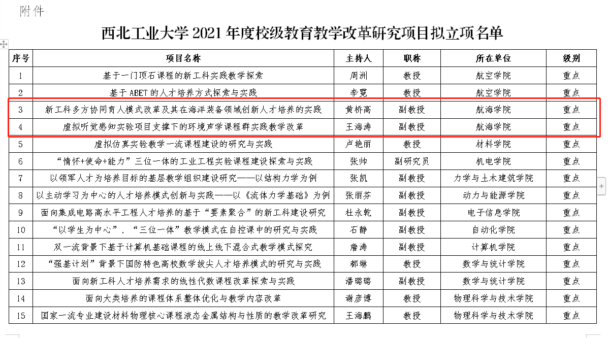 根据《关于开展2021年度校级教育教学改革研究项目申报工作的通知》要求,评选出2021年校级拟立项教育教学改革研究项目项目100项,其中重点项目30项,其中,304永利官网登录入口获批立项重点项目2项、一般项目4项。