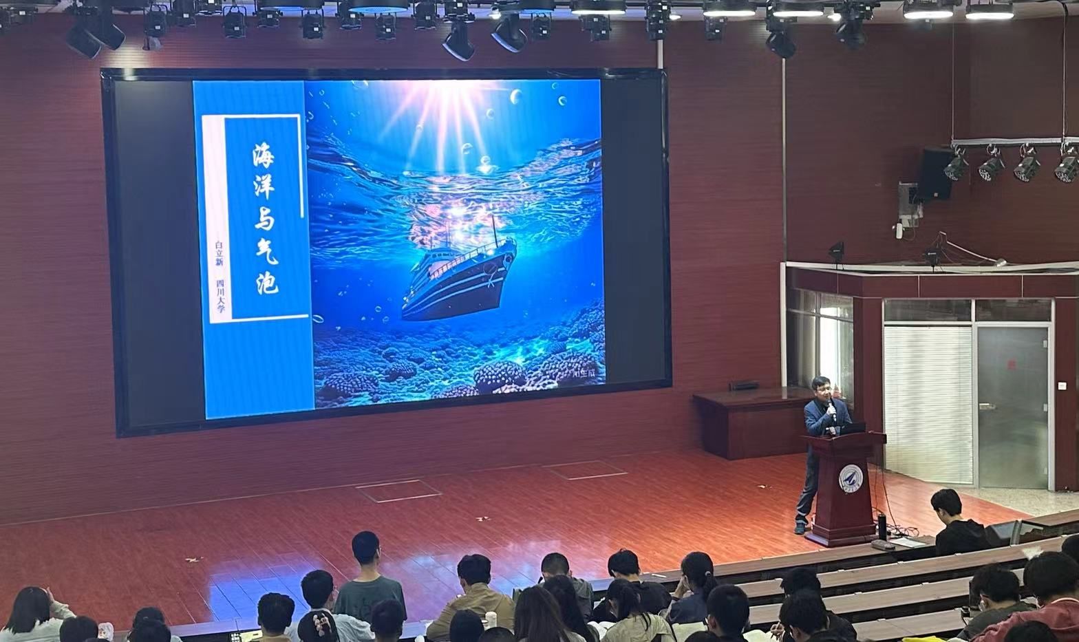 2024年5月6日,“感悟深蓝”课程第三讲暨翱翔名家讲堂于长安校区教西D100顺利举行。四川大学研究员、博士生导师白立新来到学校,以《海洋与气泡》为主题进行授课。304永利官网登录入口2023级200余名本科生聆听了讲座。戚茜老师在课前介绍了白立新研究员的简历。