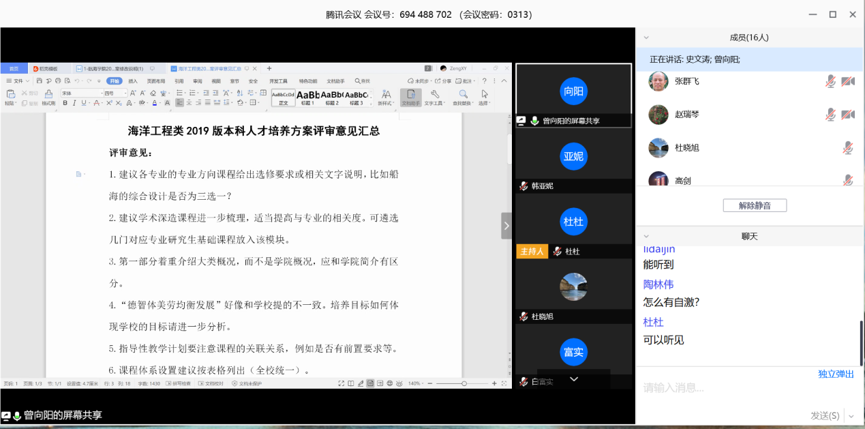 第一天的视频会议由曾向阳副院长主持,院长潘光、副院长杨坤德、院长助理史文涛、学院海洋工程大类负责人、各方向课程群负责人、本科教学秘书共17人参加。