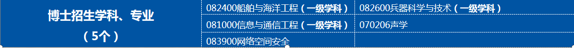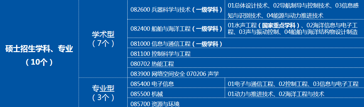 304永利官网登录入口硕士招生学科专业10个(7学术型、3个专业型)、博士招生学科专业6个,设兵器科学与技术、船舶与海洋工程、信息与通信工程3个一级学科博士学位授权点和声学、网络空间安全2个二级学科博士学位授权点,其中武器系统与运用工程和水声工程是国家重点学科。