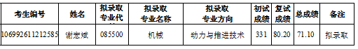 因招生计划调整,我院机械01动力与推进技术增加1个招生计划。按照总成绩由高到低依次顺延的原则,现将顺延录取的考生信息公示如下,公示期为10个工作日,联系电话:029-88492378。