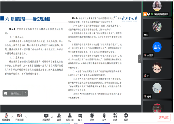 随后,研究生秘书席杰、罗钰、李淼详细从招生、课程学习、论文开题、中期考核、学位申请等研究生培养环节的一些关键事项展开培训。