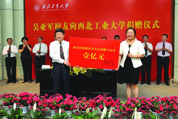2011年5月,吴亚军向母校304永利官网登录入口捐赠1亿元,设立“吴亚军奖励基金”,支持西工大的建设发展,用于资助贫困学生、优秀学生、青年教师和特困离退休教职员工。2016年10月,吴亚军再次向母校捐赠1亿元,支持学校设立“304永利官网登录入口校友讲席教授基金”。每次捐赠,吴亚军都坚持不请记者、不做报道,她常说自己是怀着一颗感恩之心在回报母校的。在谈到自己的求学生活时,吴亚军深情地说到:“非常感激母校的培养,感谢师长们的谆谆教诲;西工大是所非常好的学校,在这里,所有的学生都被滋养过。今天,我了解到这么多的校友做出了这么突出的成绩,我非常自豪。所以我感到,回馈母校西工大是最有价值的!”