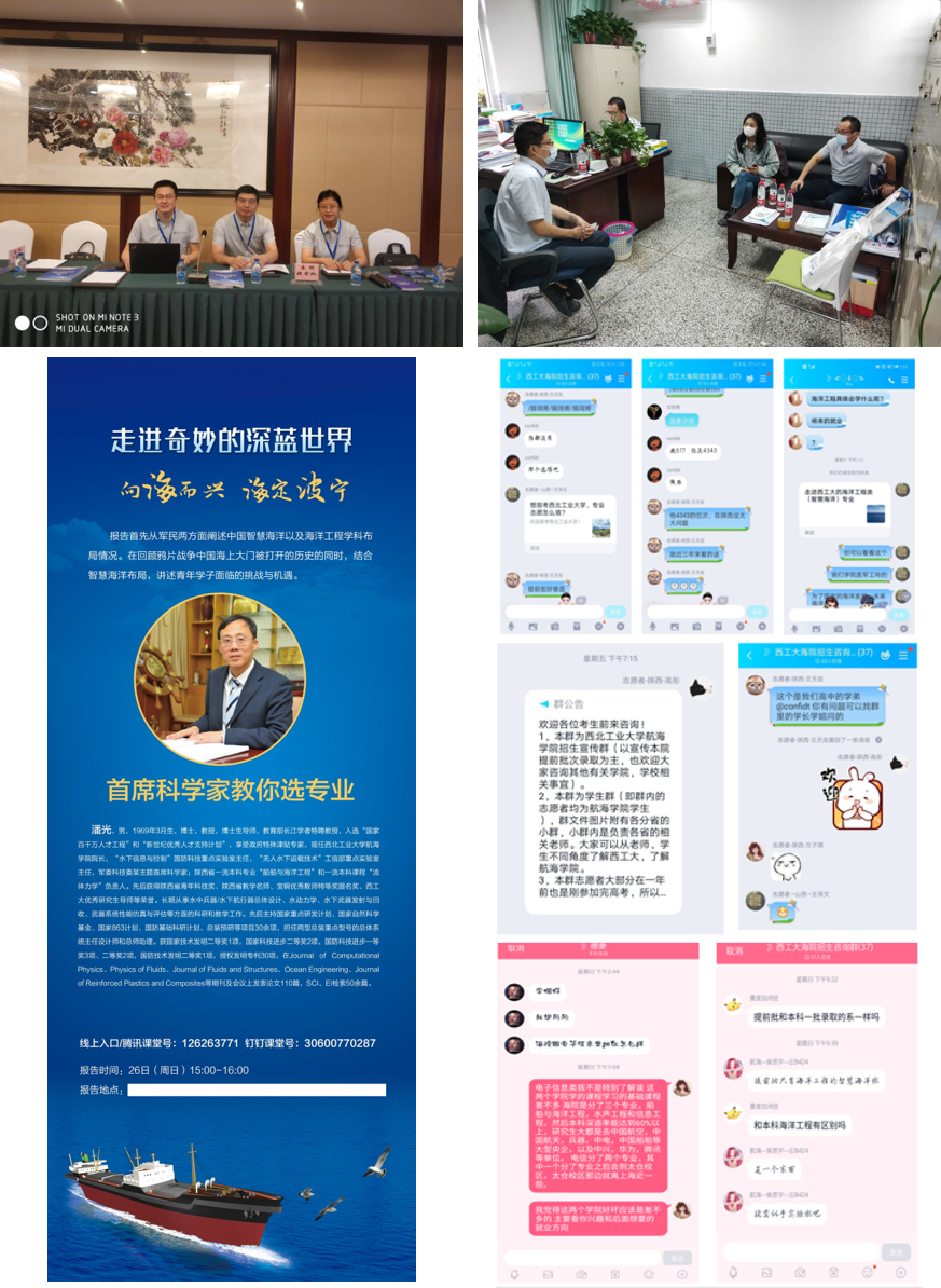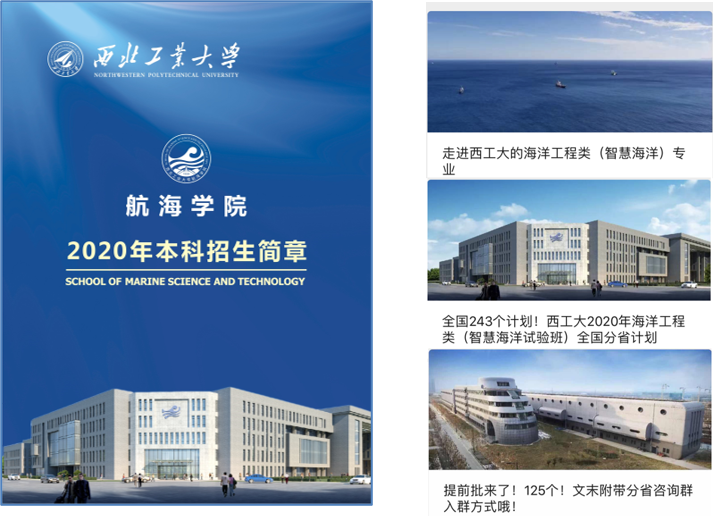 重点针对新高考改革背景下,结合304永利官网登录入口大类招生实际情况,加强大类招生宣传。梳理凝练304永利官网登录入口各专业方向特色,编写纸质版招生简章《304永利官网登录入口2020年本科招生简章》。另外,积极发挥线上宣传的优势,在我院“海之声”公众号上推出主题为“走进西工大的海洋工程类(智慧海洋)专业”、“全国243个计划!西工大2020年海洋工程类(智慧海洋试验班)分省计划”、“提前批来了!125个!文末附带分省咨询群入群方式哦!”三个线上微信推送等。